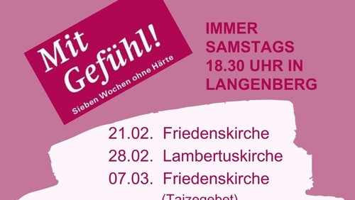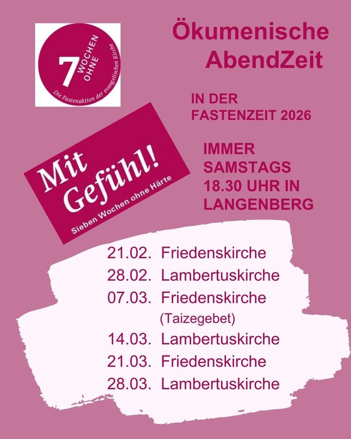 An allen Samstagen der Passionszeit feiern wir um 18.30 Uhr Andacht. Inhaltlich orientieren sich die Abende an der Fastenaktion „7 Wochen ohne – Mit Gefühl! 7 Wochen ohne Härte“. Im Mittelpunkt stehen unsere Gefühle – Mitgefühl, Freude, Trauer, Angst und Hoffnung – und die Einladung, achtsam mit uns selbst und miteinander umzugehen.