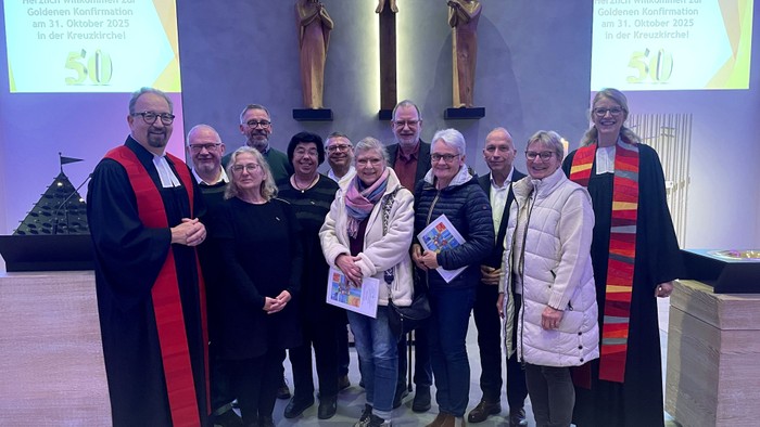 10 Männer und Frauen erneuerten nach 50 Jahren in einem Festgottesdienst am Reformationstag in der Wiedenbrücker Kreuzkirche ihr Konfirmations-Versprechen. Für manche der 1974 und 1975 Konfirmierten war es der erste Besuch in der 2017 umgestalteten Kreuzkirche. Pfarrerin Sarah Töws und Pfarrer Marco Beuermann erinnerten an die vergangen 50 Jahre und legten allen Jubilaren die Hände zum Segen auf.