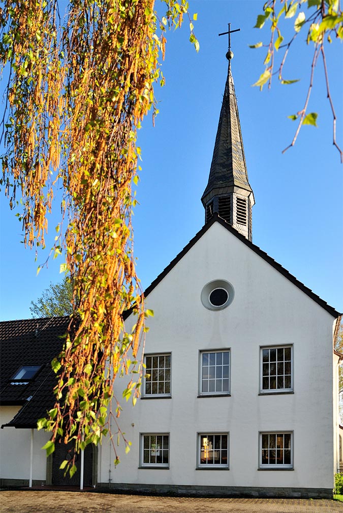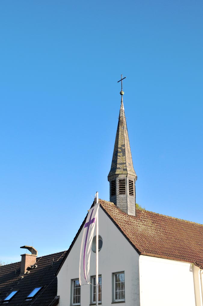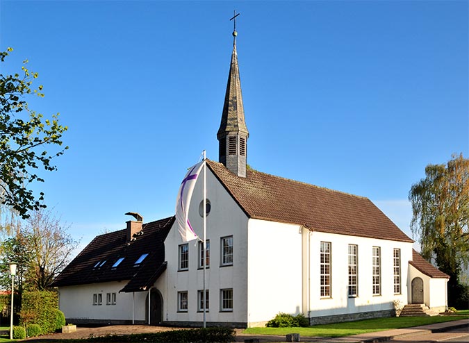 Der evangelische Gottesdienst fand erst in der Gaststätte Brill und später in der katholischen Kirche statt. Der Wunsch nach einer eigenen Kirche wurde aber immer größer und im Rahmen des "Kirchlichen Notprogrammes" ergab sich die Möglichkeit, dieses auch zu verwirklichen. Mit großer, auch finanzieller Unterstützung aller Gemeindeglieder, wurde 1950 das Grundstück erworben.